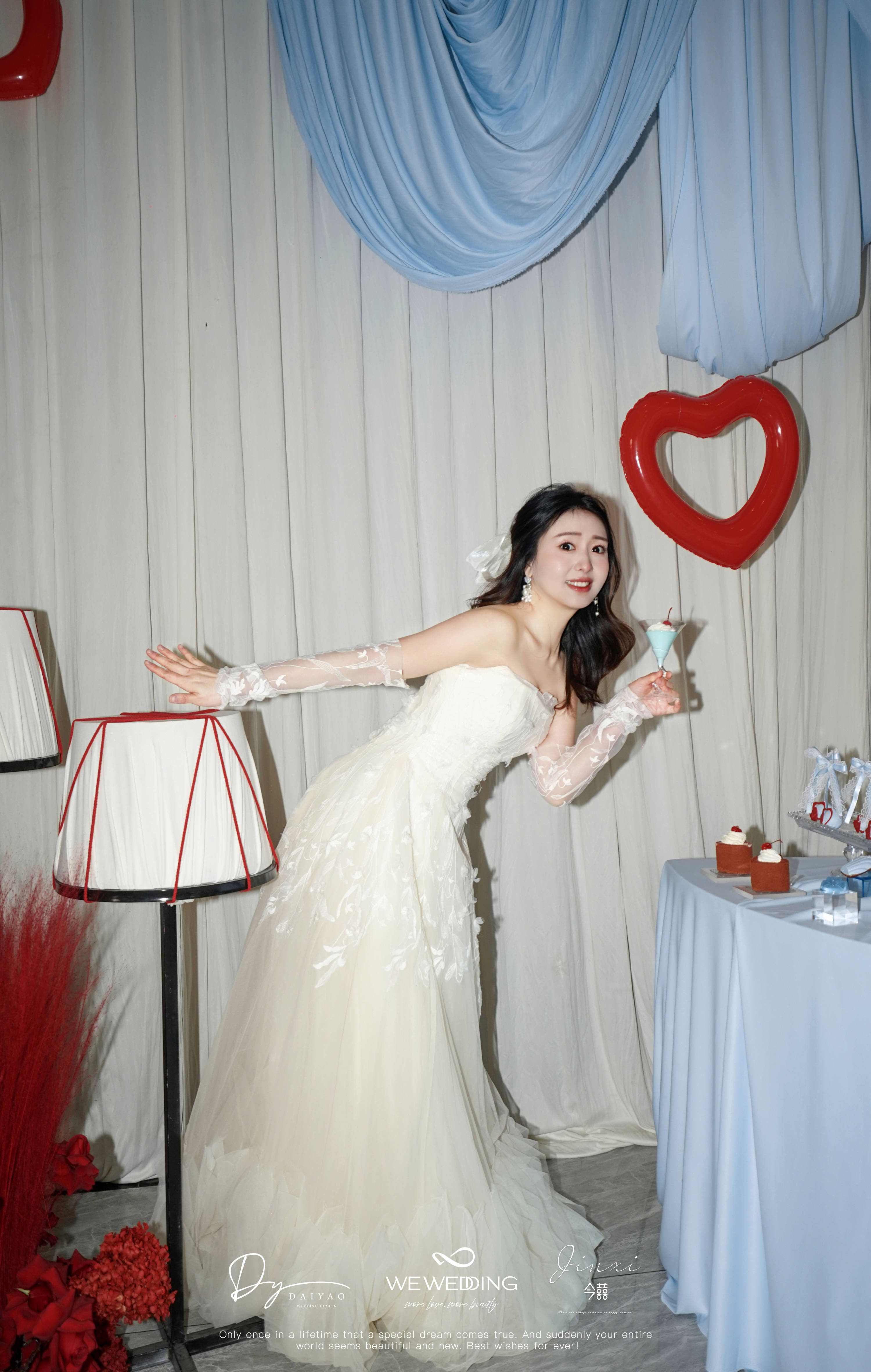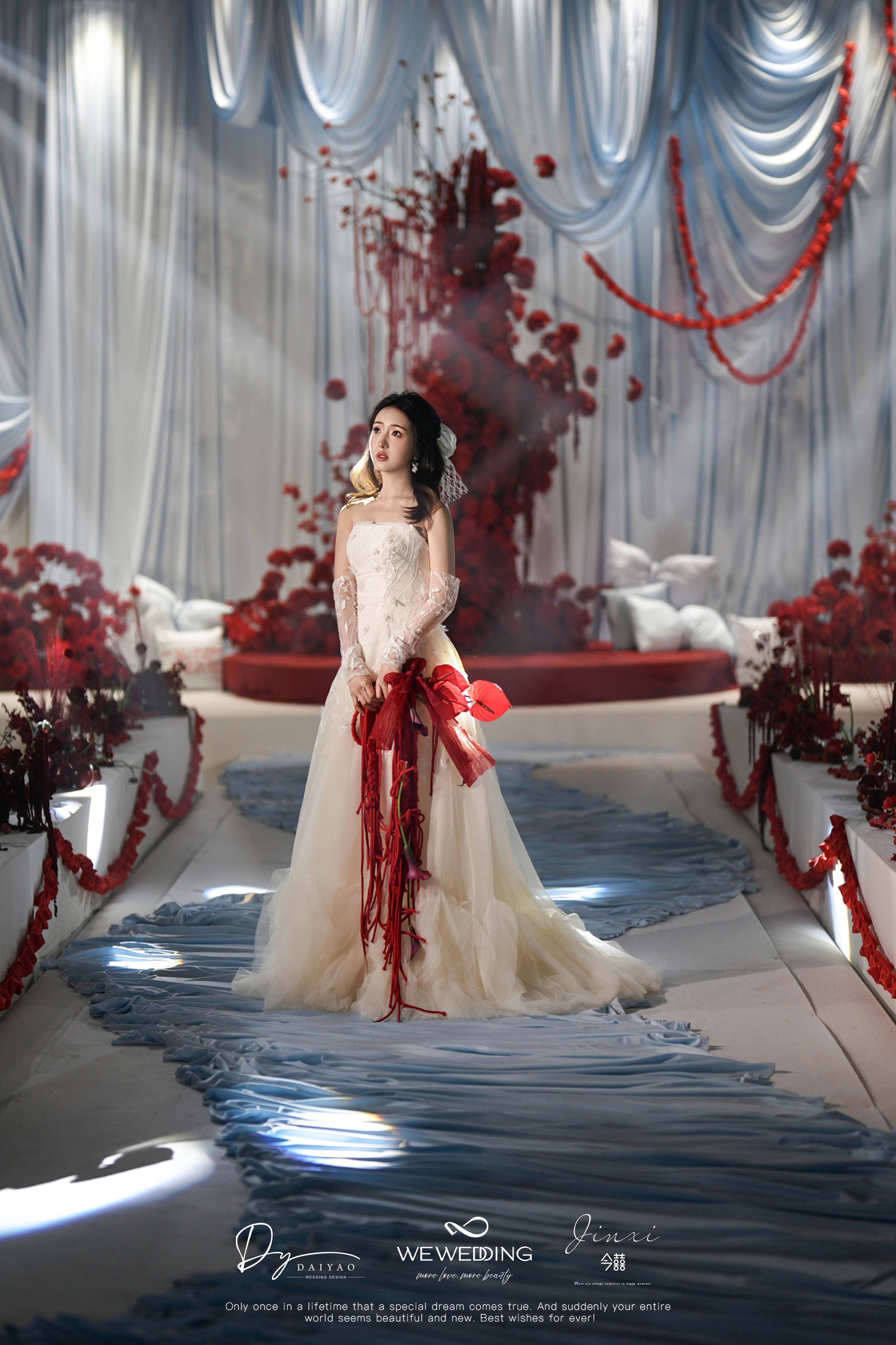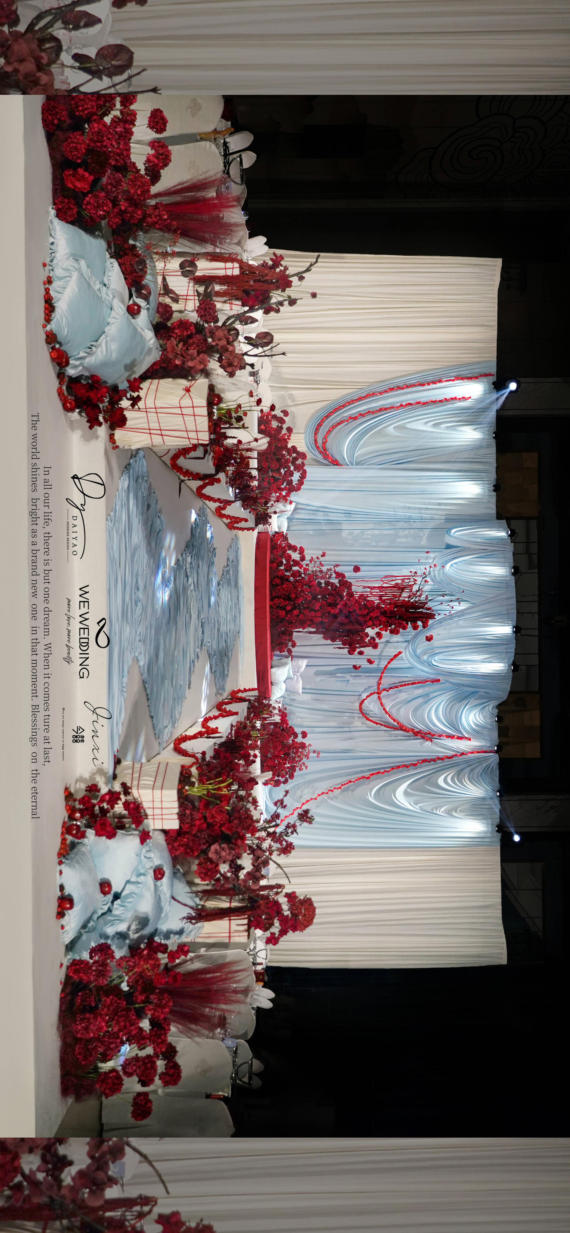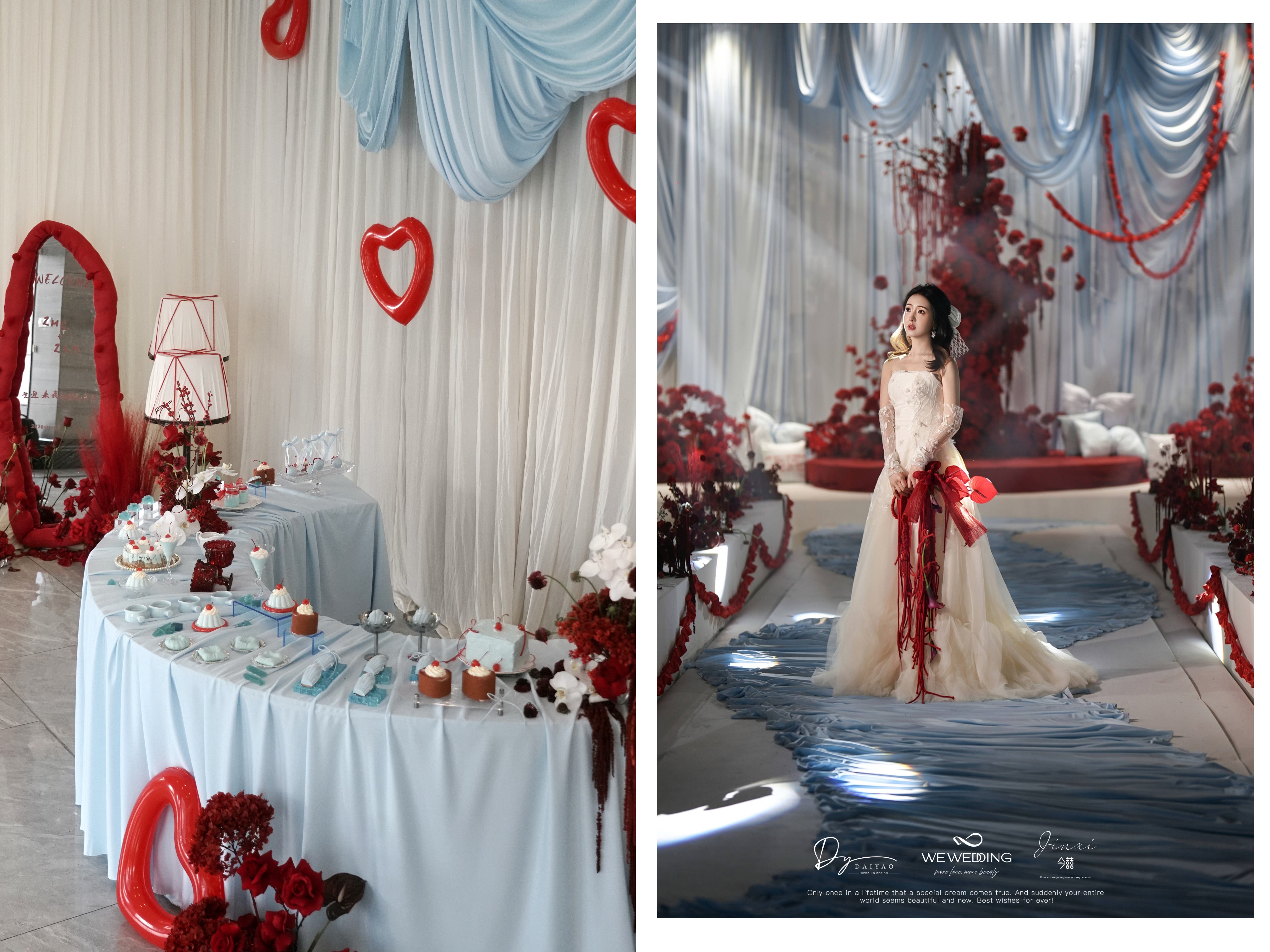 新娘是乖巧可爱类型,我想在已经指定的白,红色的基础上增加符合新娘特色的元素。联想到他们在国外定居的地方也是以海滩闻名全球。也是现场加入"海盐蓝"元素