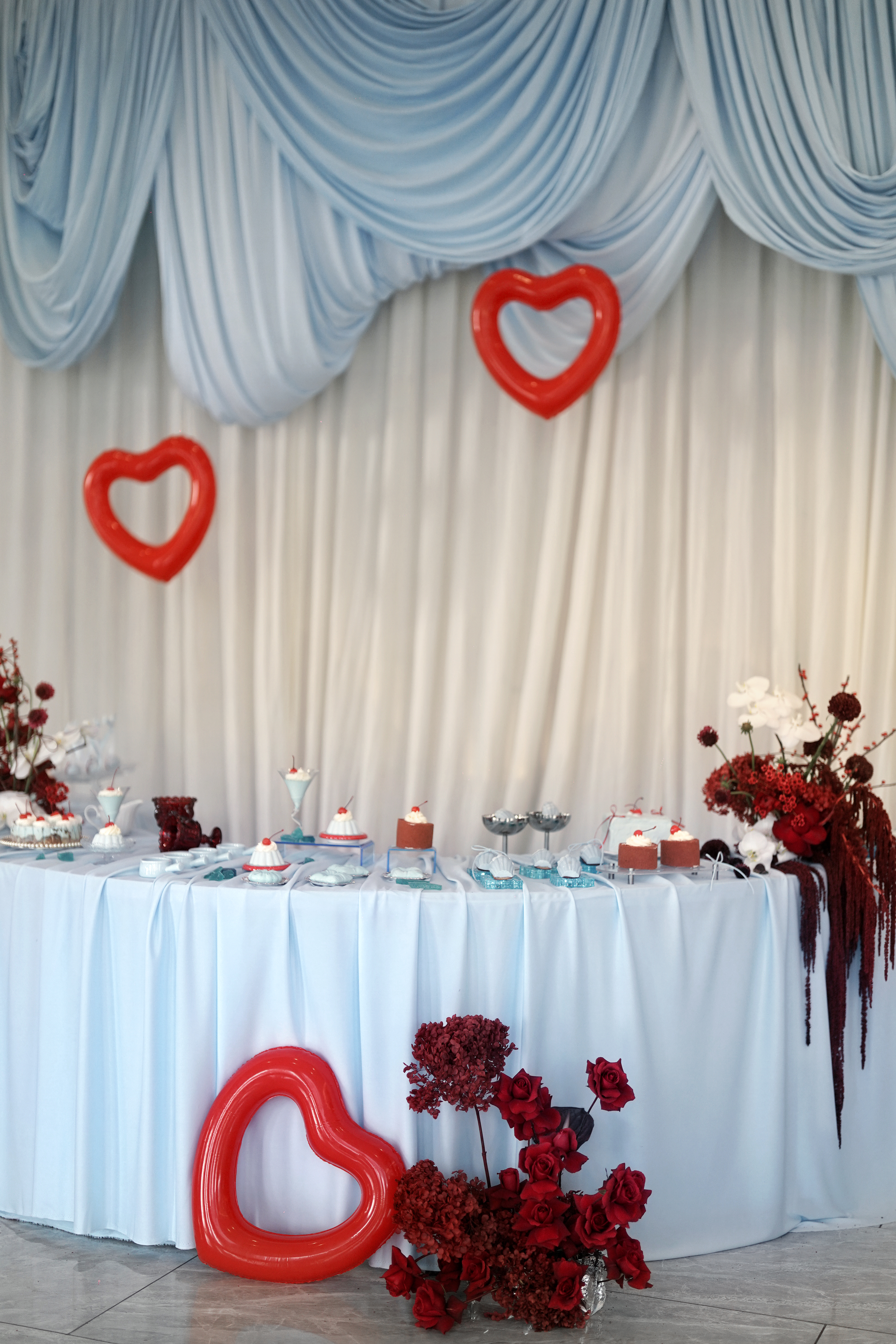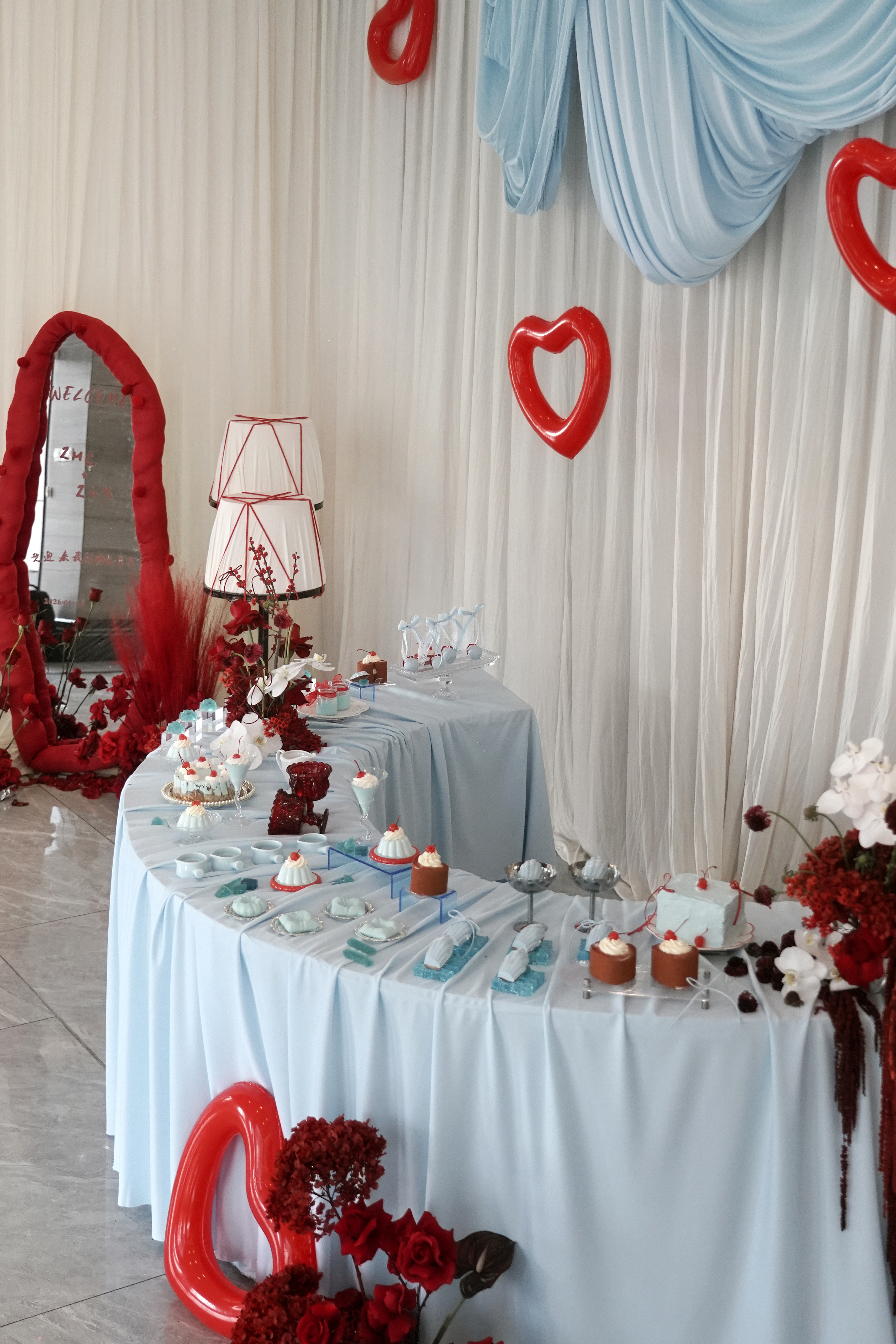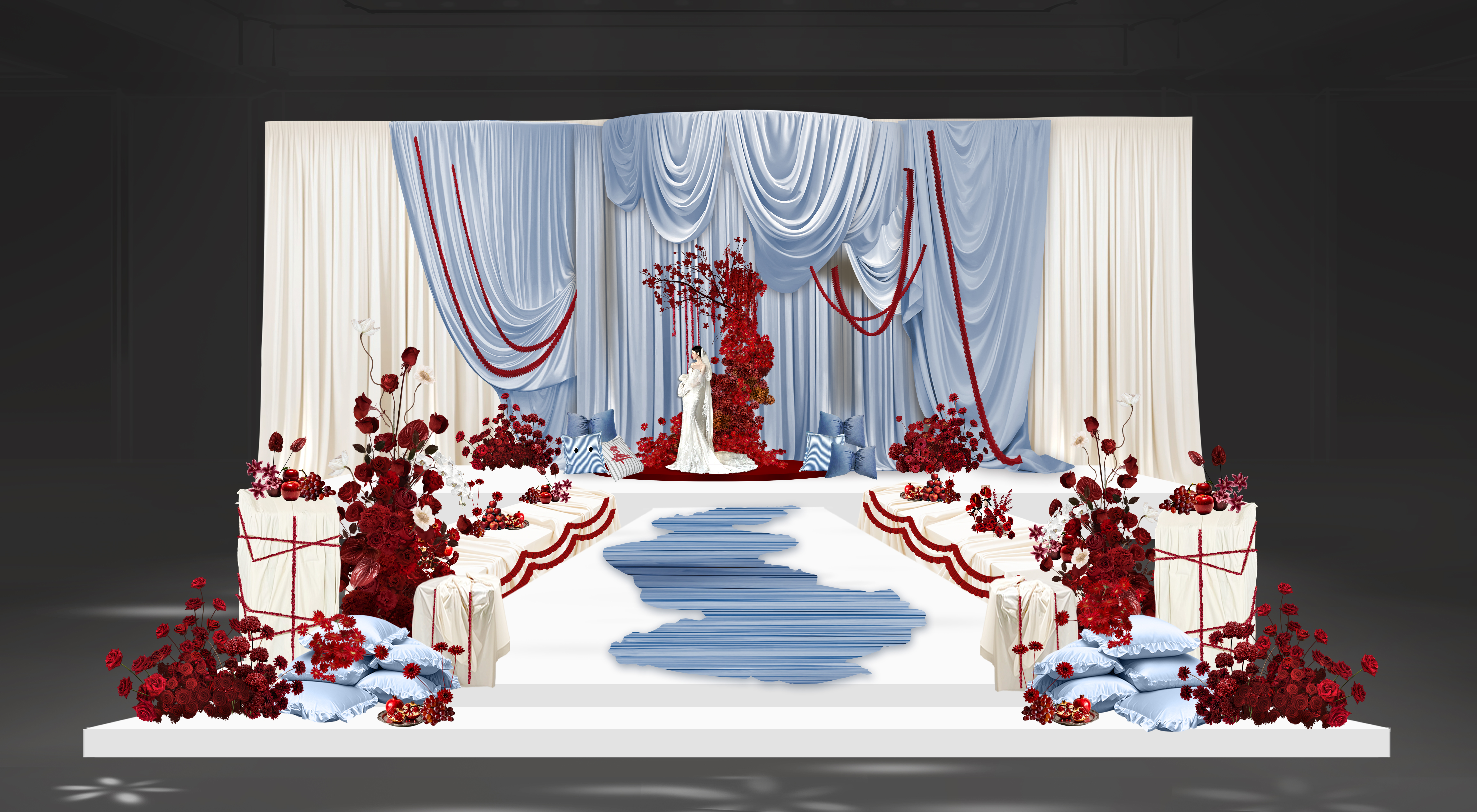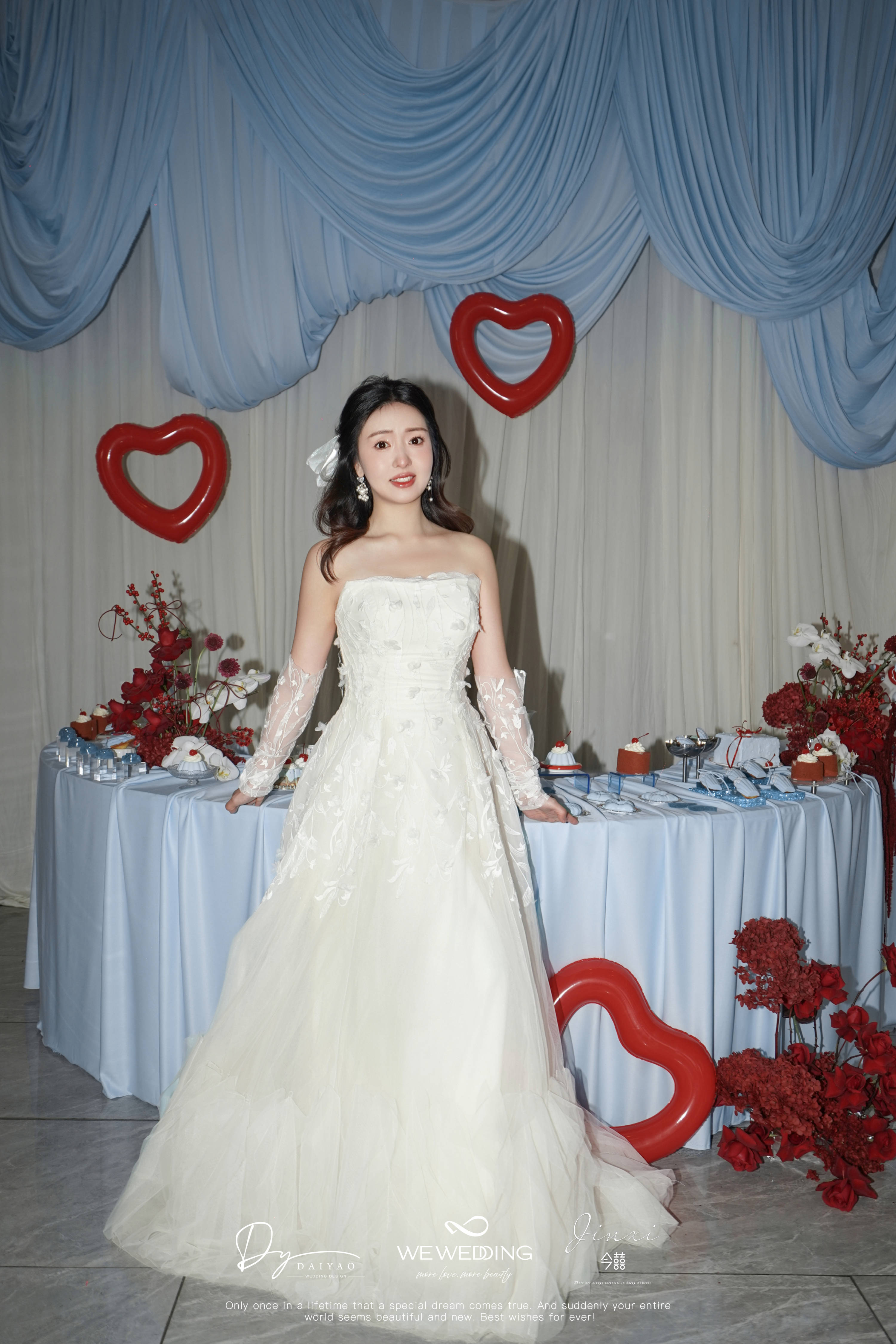 新娘是乖巧可爱类型,我想在已经指定的白,红色的基础上增加符合新娘特色的元素。联想到他们在国外定居的地方也是以海滩闻名全球。也是现场加入"海盐蓝"元素