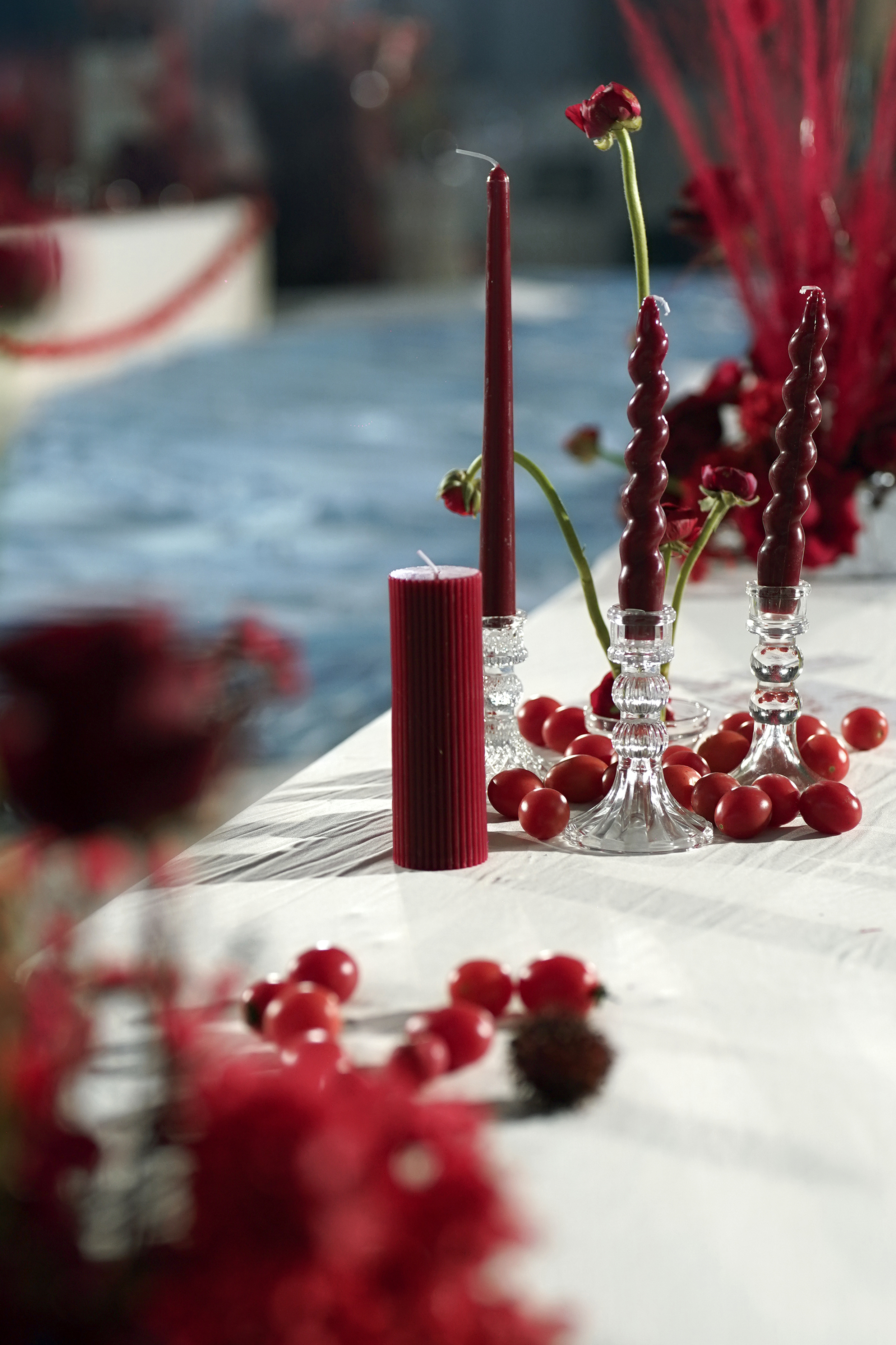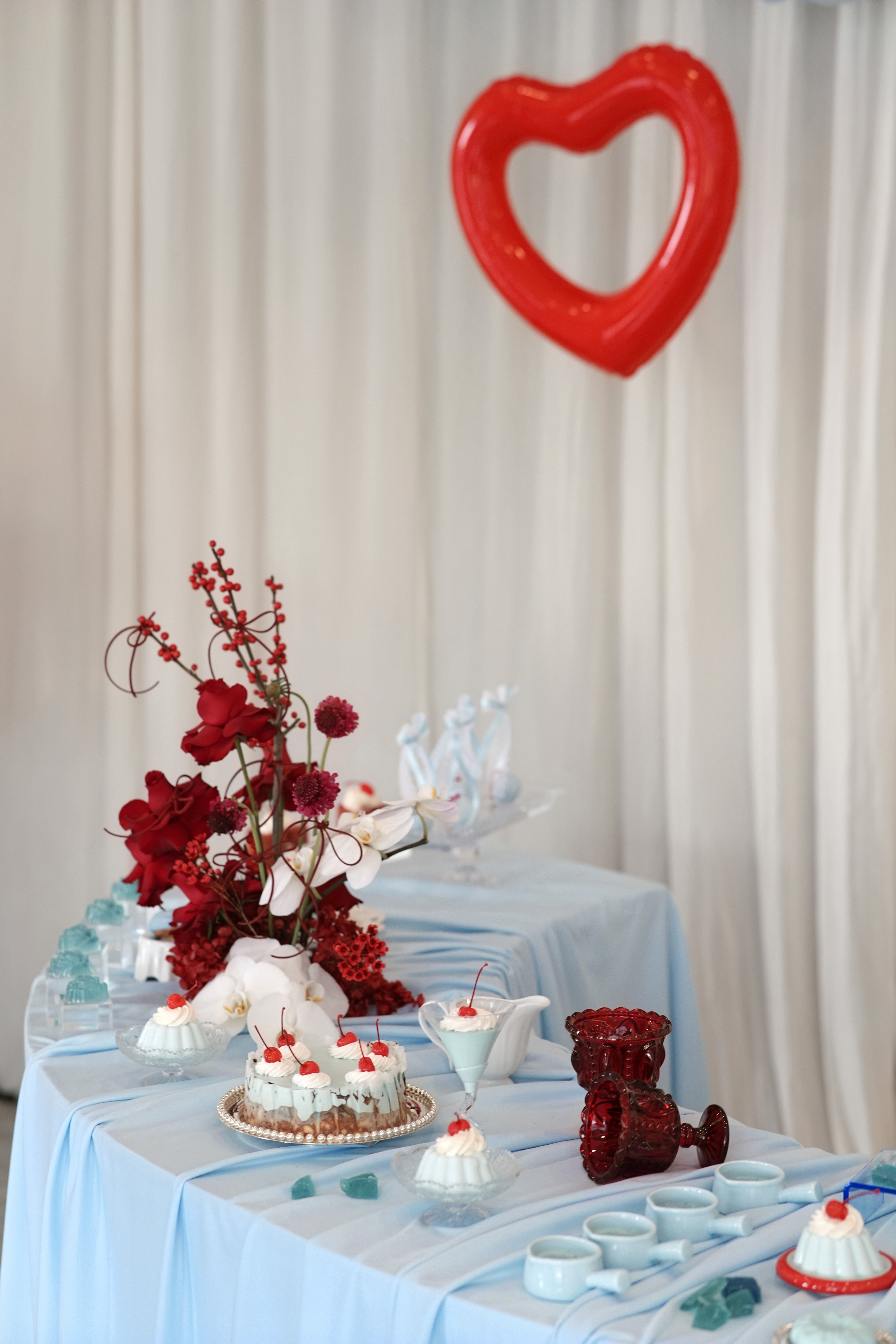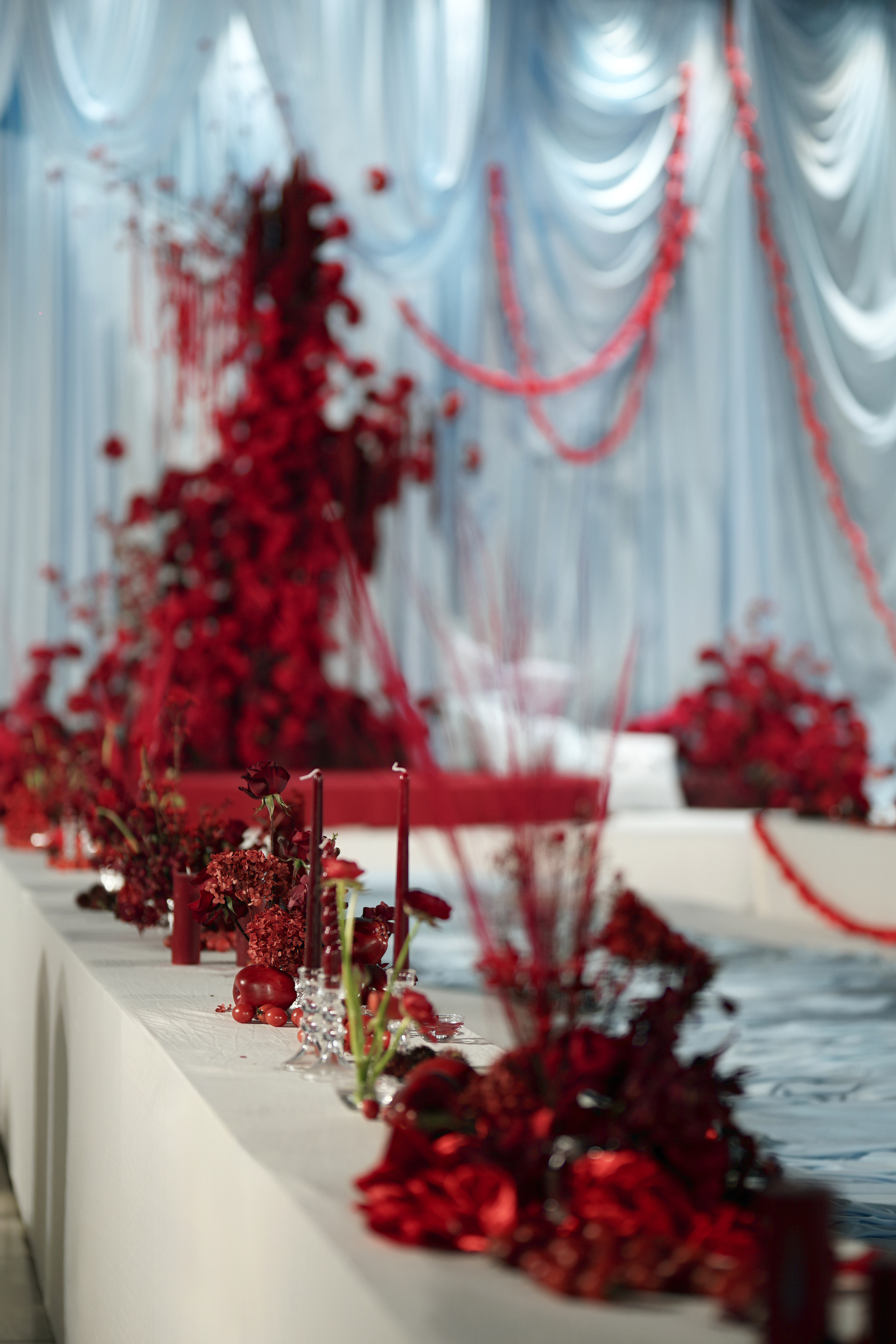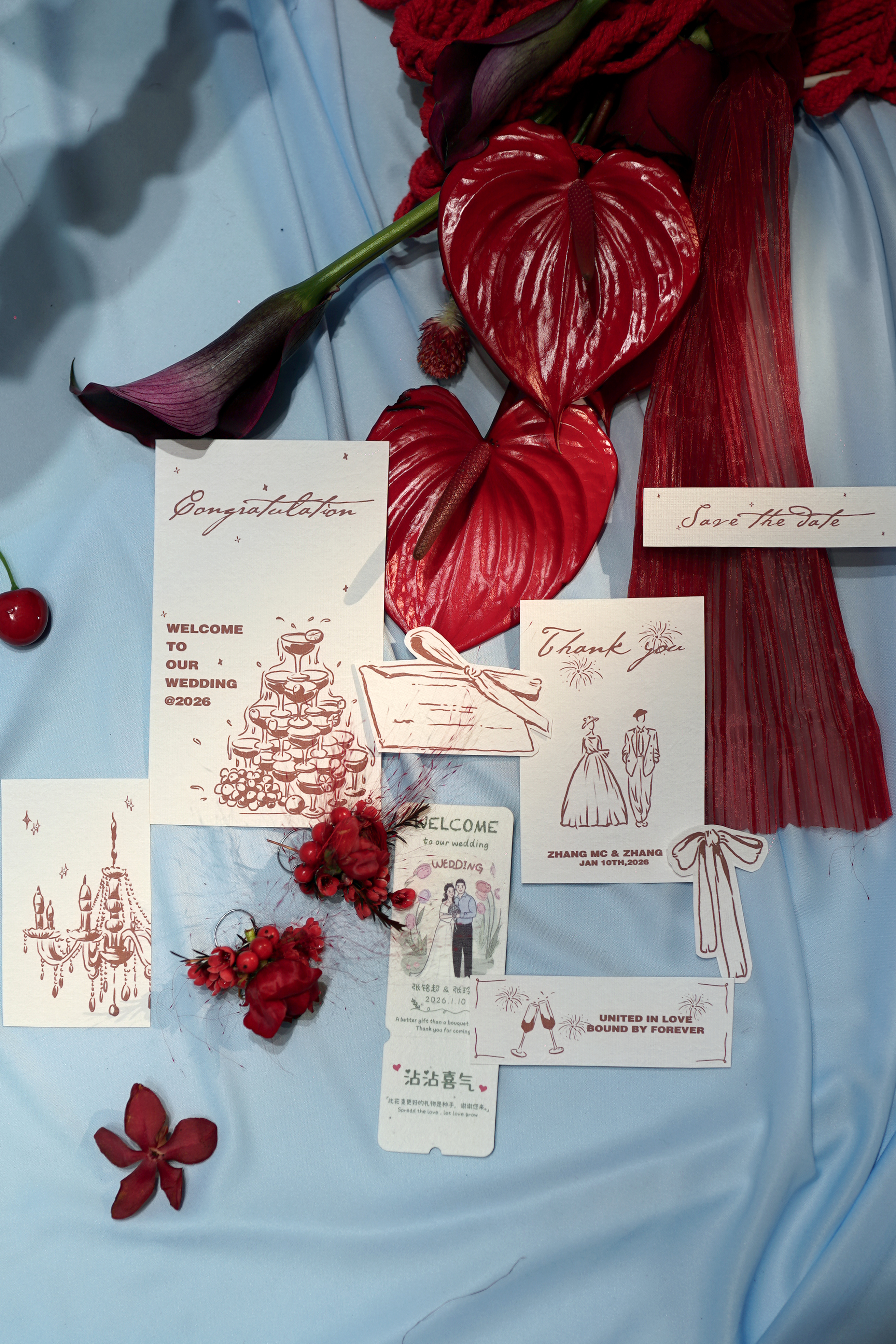 新娘是乖巧可爱类型,我想在已经指定的白,红色的基础上增加符合新娘特色的元素。联想到他们在国外定居的地方也是以海滩闻名全球。也是现场加入"海盐蓝"元素