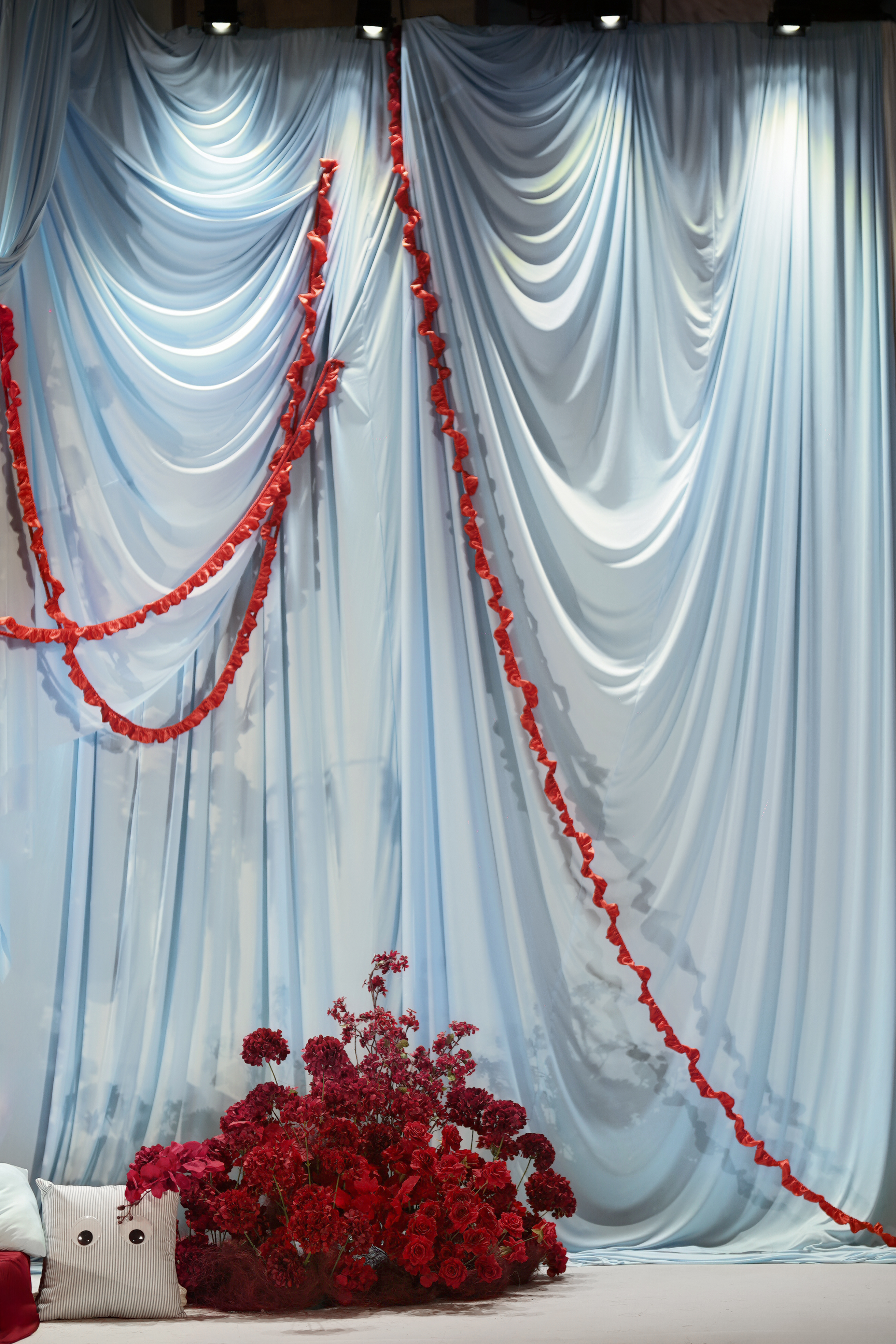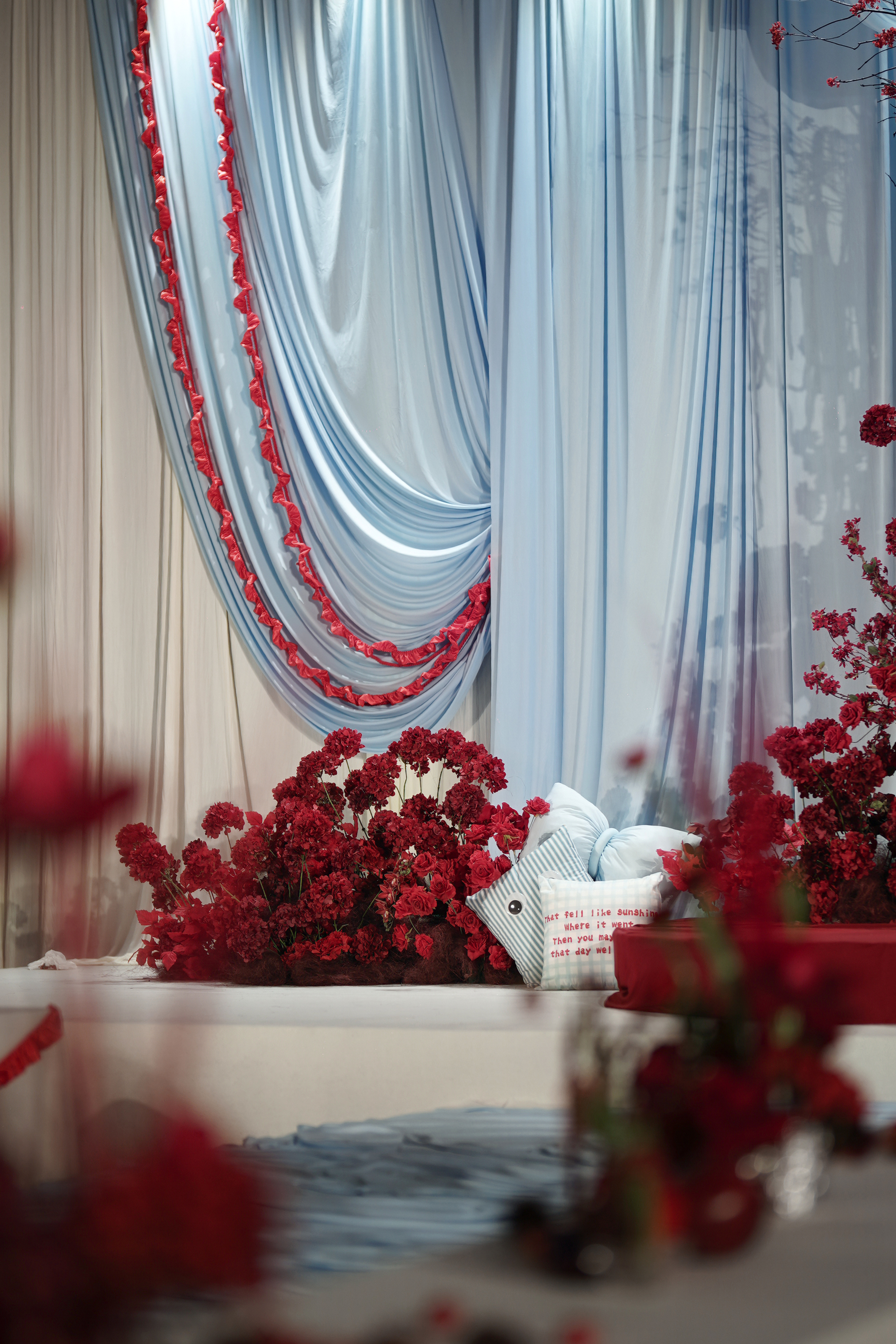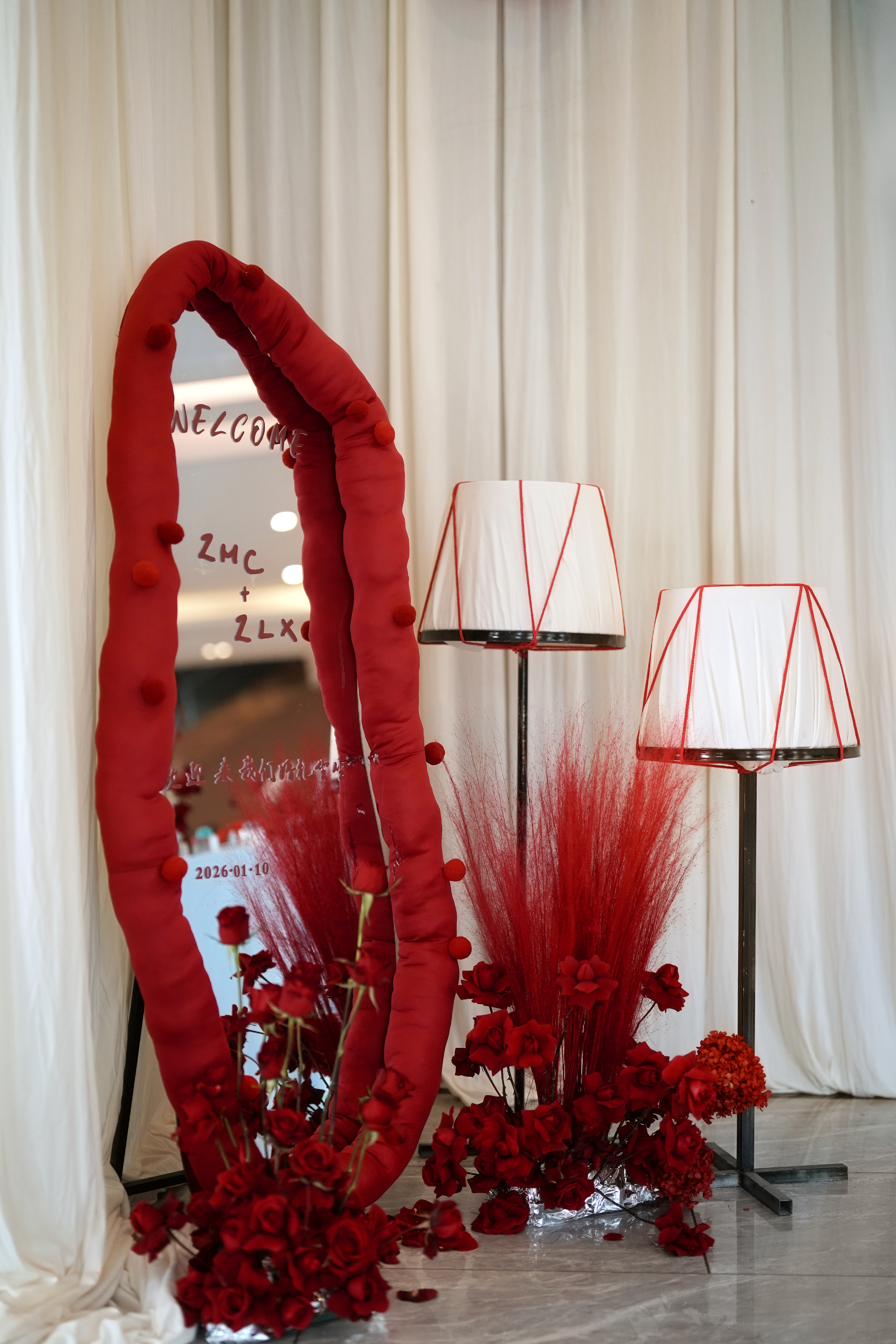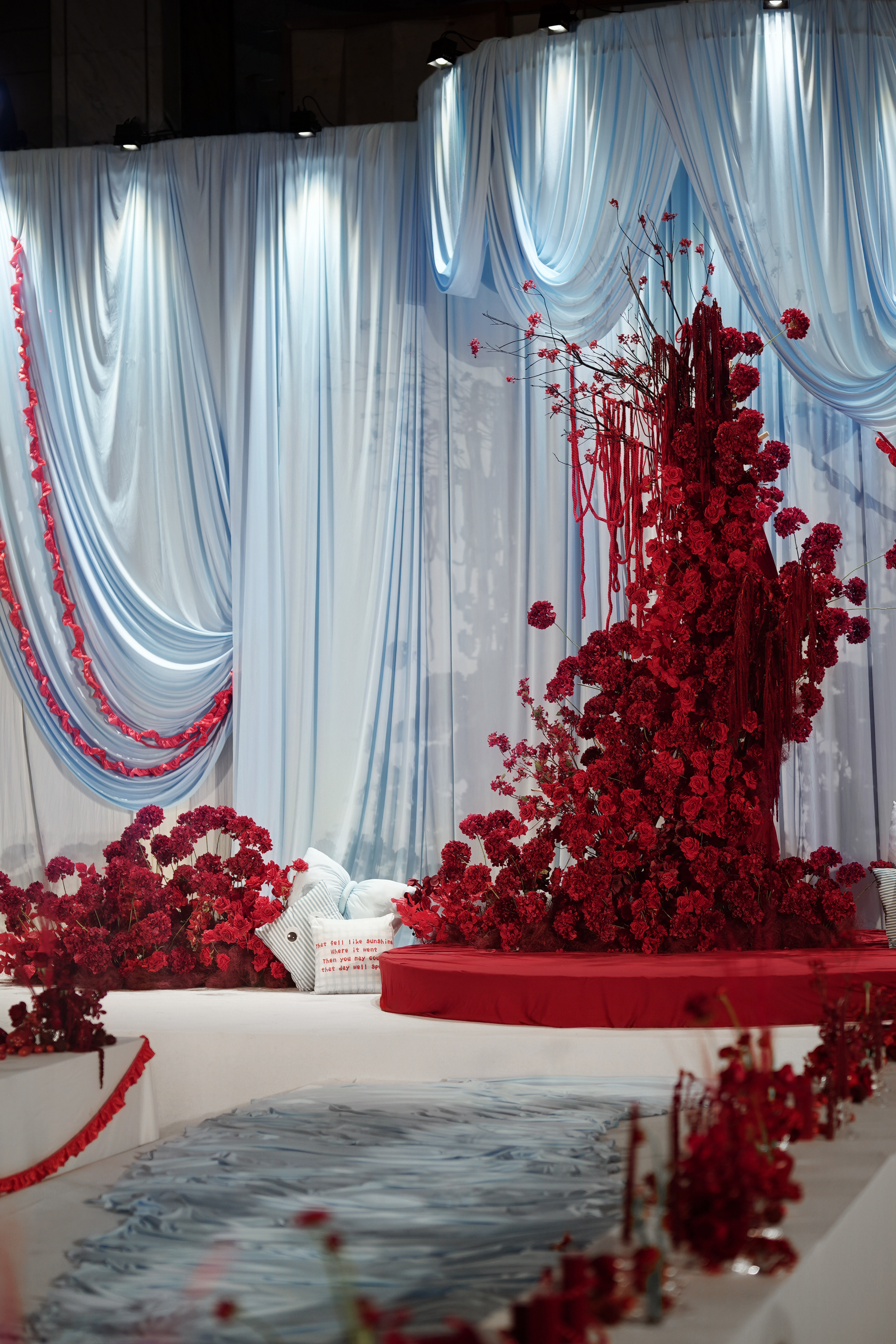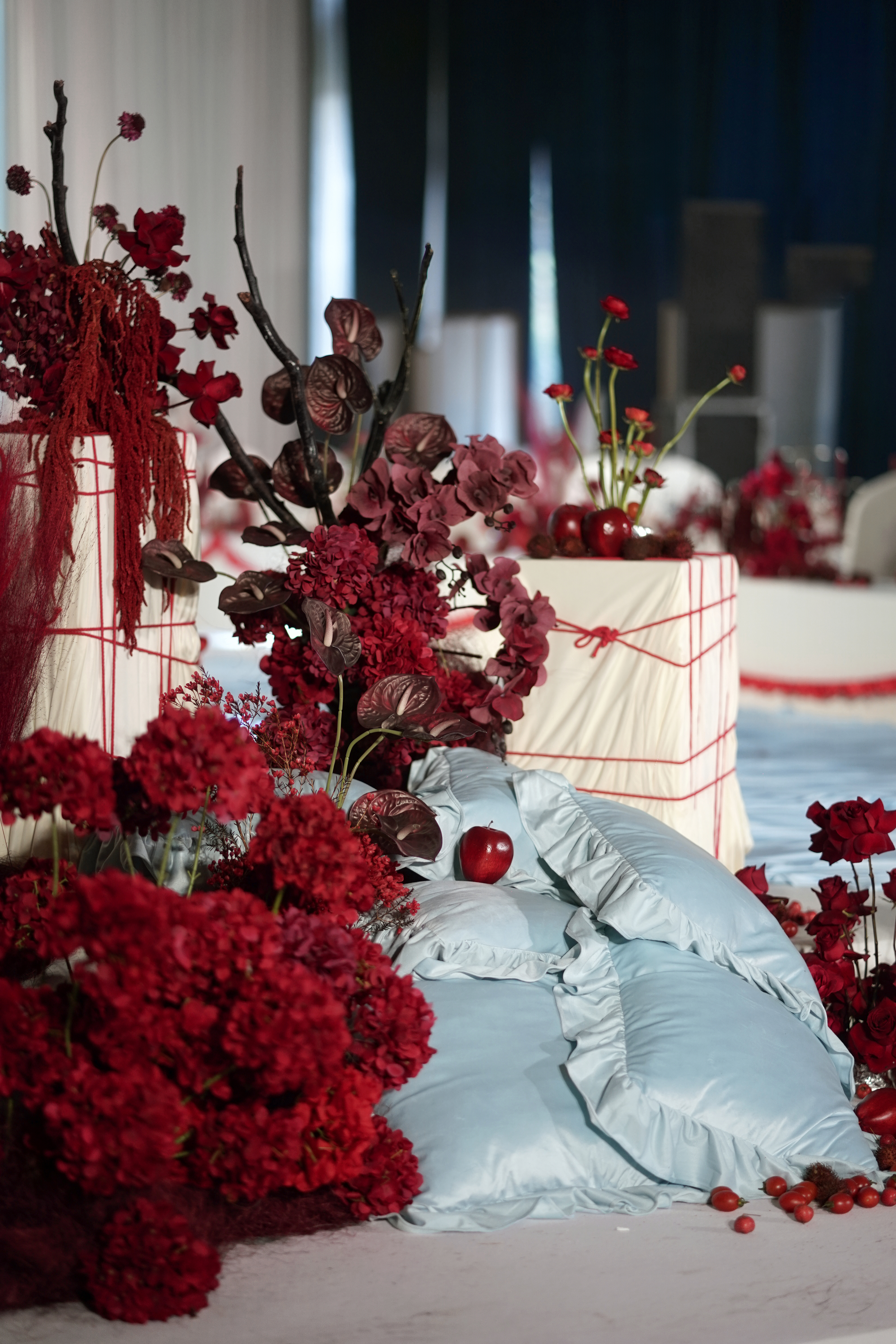 设计灵感:父母要求白色背景和地毯,不要白色花,要红色花,但不能用红色扶郎花
